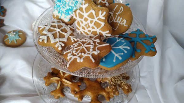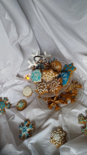 4 mm vastagságúra nyújtom, kiszúrom, tej és tojássárgája keverékével lekenem. Én ez alkalommal hópelyheket készítettem, mandulával és kókusszal díszítettem. Akinek van kuktája, az ennél a műveletnél befoghatja.