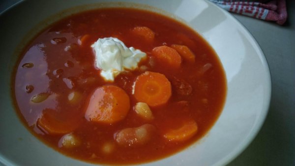 2 nagy sárgarépát fél centi vastagon felkarikáztam, kacsazsíron megfuttattam. Karikázta még bele egy szál csípős snack-kolbászt. Hagytam, hogy kiengedje az erejét. Rázuttyintottam egy fehérbab-konzerv teljes tartalmát, majd utána küldtem egy kis konzerv sűrített paradicsomot is. Felöntöttem kb. 6-7 deci vízzel, sóztam, borsoztam, vegetáztam. Hagytam egyet forrni, aztán el is zártam alatta a gázt.